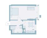 Общая площадь составляет 38,48 м2, кухня-студия 21,84 м2.