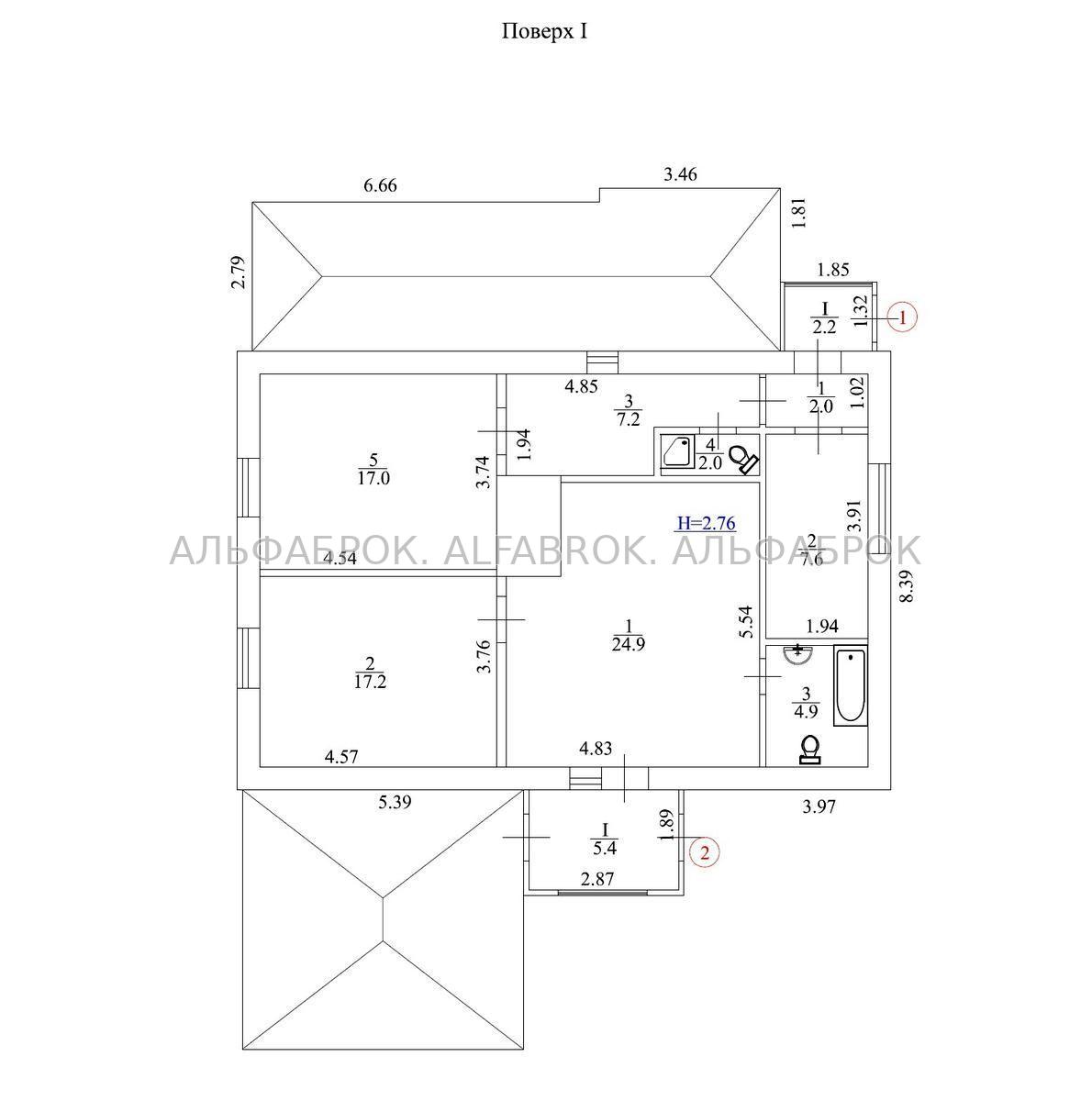 Перший поверх 12*8 м, другий - 5,5*10 м, тераса на другому поверсі - 8*1,5 м.