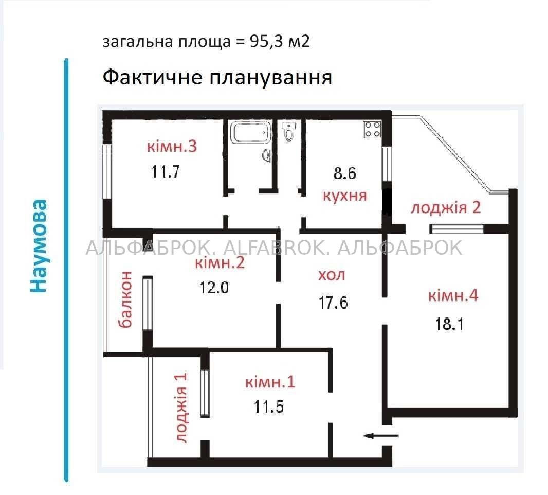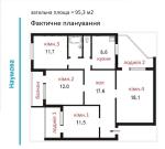 Площа квартири 95 кв.м., житлова 53,3 кв.м., кухня 8,6 кв.м.