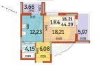 Загальна площа 44,29 кв м: - кухня: 12,23 кв.м. - кімната: 18,21 кв.м. - санвузол: 4,15 кв.м. - дві лоджії: 6,0 та 3.7 кв.м.